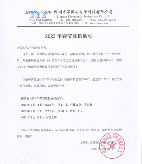 深國安2023年春節(jié)放假安排如下:放假時(shí)間:2023年1月18日-2023年1月28日,共放假11天(2023年1月29日初八正常上班)(放假期間正常接單,統(tǒng)一年后安排生產(chǎn)與發(fā)貨!)正值春節(jié)來臨...