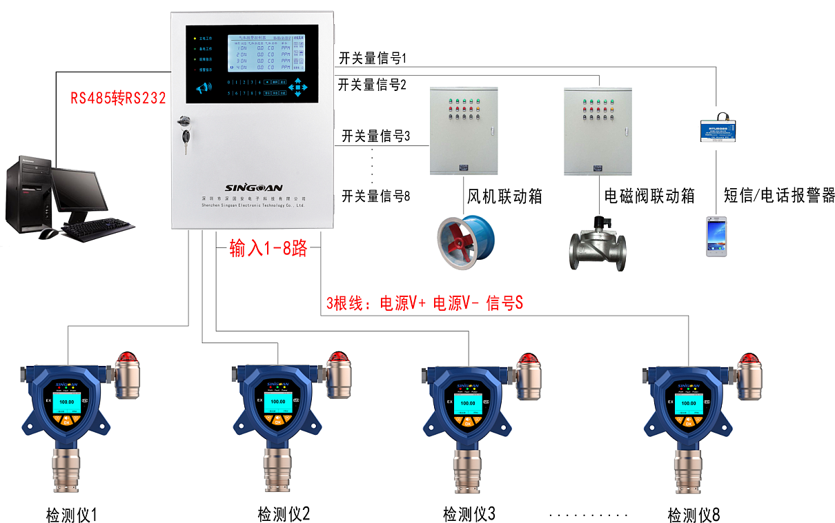 SGA-800B氣體報(bào)警控制器是深國(guó)安電子推出的一款分線制液晶顯示型氣體控制器;最大支持8路4-20mA信號(hào)輸出的氣體檢測(cè)儀接入;分線制控制,避免了因個(gè)別氣體檢測(cè)儀故障,而引起整個(gè)系統(tǒng)癱瘓的風(fēng)險(xiǎn);當(dāng)現(xiàn)場(chǎng)連接的任意1路氣體檢測(cè)儀達(dá)到預(yù)設(shè)報(bào)警點(diǎn)時(shí),控制器會(huì)自動(dòng)發(fā)出85分貝以上的聲光報(bào)警,提醒人員安全撤離;標(biāo)配8組常開(kāi)常閉無(wú)源觸點(diǎn)繼電器輸出,方便每路氣體檢測(cè)儀聯(lián)動(dòng)控制不同的設(shè)備;還可選配深國(guó)安專用監(jiān)控軟件,進(jìn)行數(shù)據(jù)查詢、導(dǎo)出、曲線顯示等;