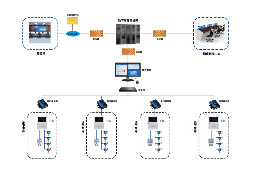 3.接著氣體檢測(cè)儀監(jiān)測(cè)到一氧化碳?xì)怏w時(shí),氣體控制器用于發(fā)出報(bào)警信號(hào)并開啟風(fēng)機(jī),串口服務(wù)器接收控制器發(fā)出的報(bào)警信號(hào)并回傳至軟件系統(tǒng),軟件系統(tǒng)收到報(bào)警信號(hào)后,通過地下車庫(kù)局域網(wǎng)把報(bào)警信息和數(shù)據(jù)傳輸至安監(jiān)局和調(diào)度指揮中心,安監(jiān)局通過網(wǎng)絡(luò)以短信的方式把一氧化碳監(jiān)測(cè)信息發(fā)送到移動(dòng)平臺(tái)。